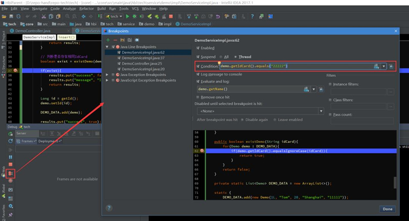 Java Line Breakpoints 显示了所有的断点,在右边勾选Condition,设置断点的条件。